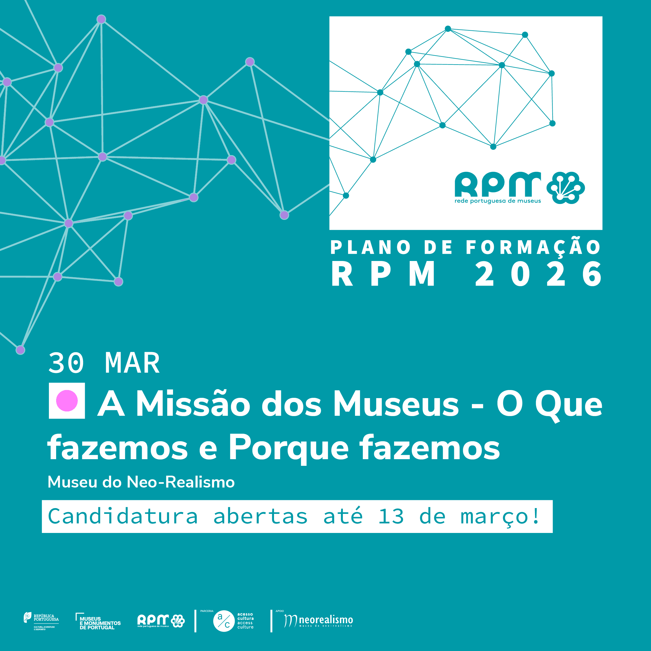 A formação constitui um dos eixos estruturantes de atuação da RPM, visando contribuir para a qualificação das equipas ao serviço dos museus portugueses e promover boas práticas nas áreas nucleares da atividade museológica. Dirige-se a profissionais de museus, com prioridade para os que integram a Rede, e assenta na organização de cursos...
